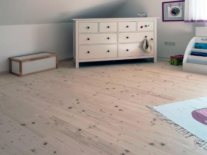 Keine Massivholzdiele ist „fußwärmer“ als eine Fichtendiele. Diese Besonderheit verdankt sie ihren großen Weichholzzonen. Ihr heller Farbton und das homogene Holzbild lassen jeden Raum mit Fichtendielen freundlich und wohnlich erscheinen. Ein mäßiger Astanteil und die charakterstarke Maserung machen dennoch jeden Boden zu einem Unikat. Durch maschinelles Bürsten wird die Widerstandsfähigkeit des Bodens erhöht.